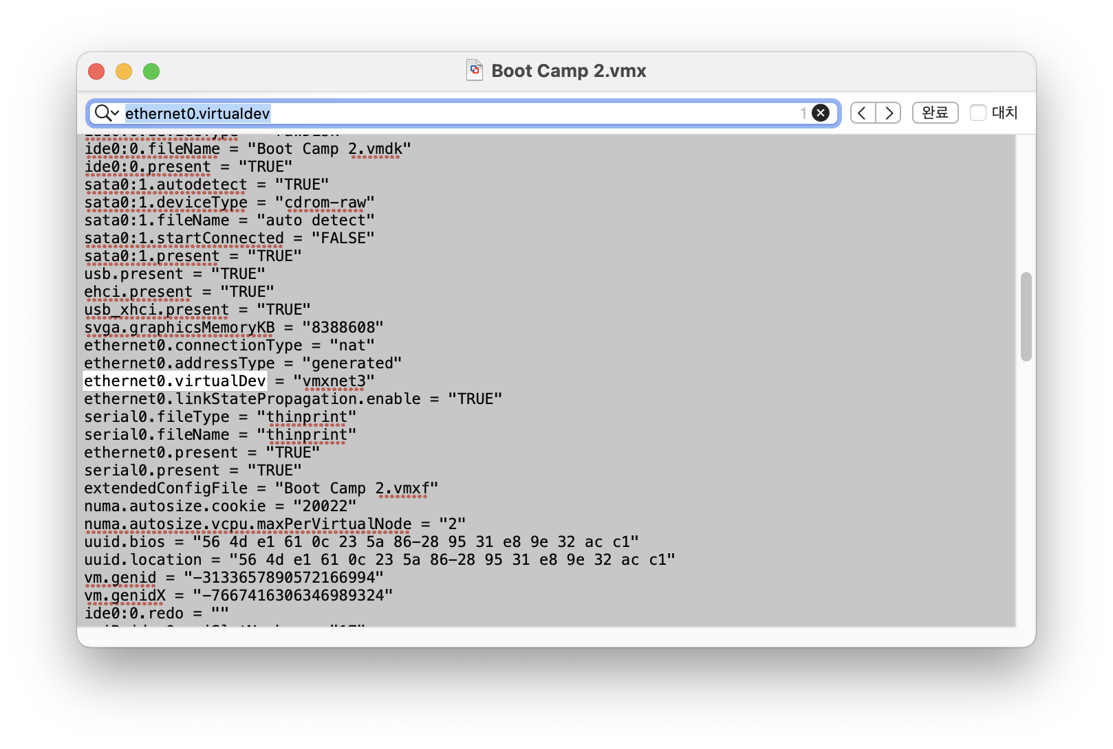 서치결과 .vmx 파일을 메모장으로 열어서 하기 내용을 변경해주면 된다는 군요