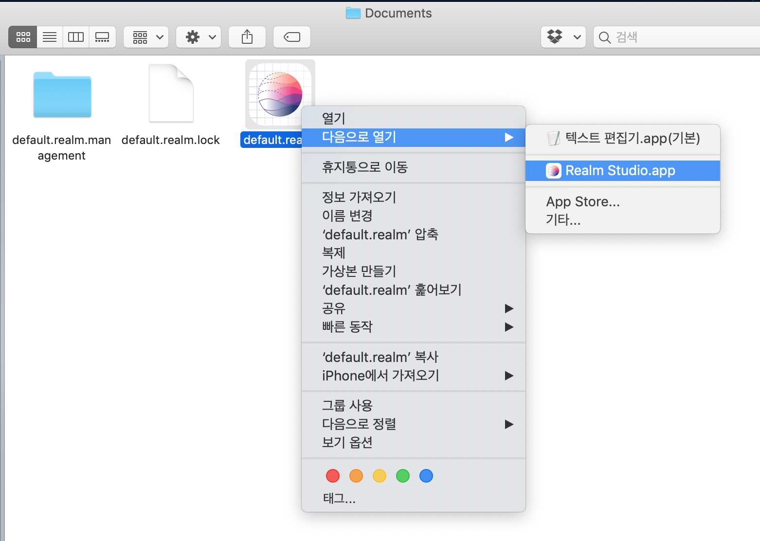 렘파일 위에서 오른쪽 버튼 > 다음으로 열기 > Realm Studio를 엽니다.