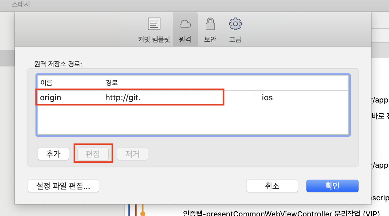 2. 편집 화면에서 URL/경로 칸에 이미 설정되어있는 원격 경로 주소가 보입니다. 그 부분을 수정하시고 확인 버튼을 누릅니다.