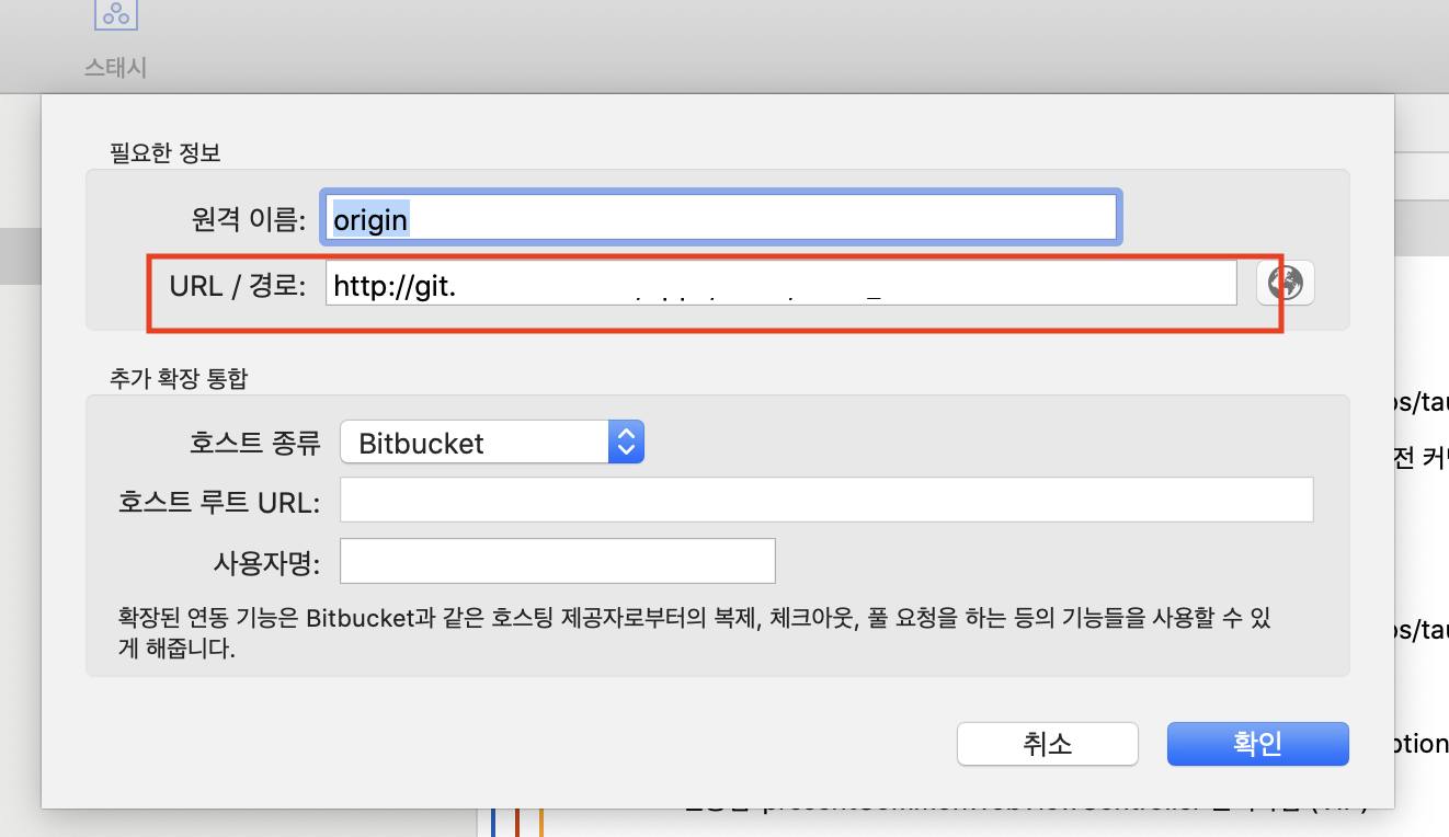 2. 편집 화면에서 URL/경로 칸에 이미 설정되어있는 원격 경로 주소가 보입니다. 그 부분을 수정하시고 확인 버튼을 누릅니다.