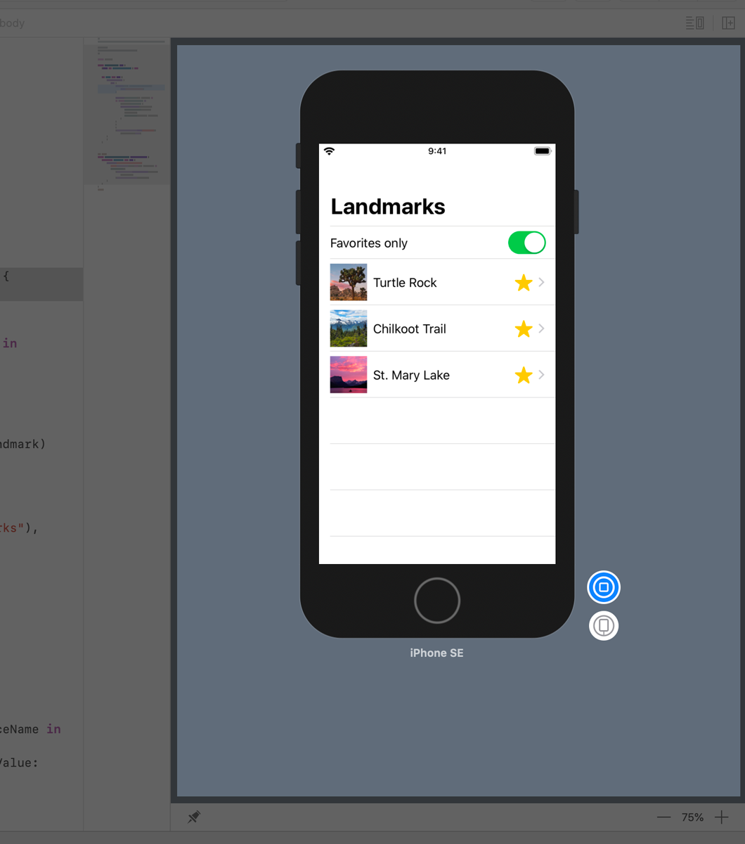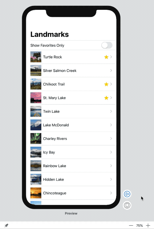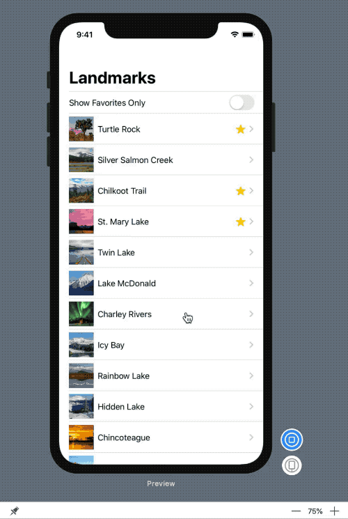 In the Landmarks app, a user can flag their favorite places, and filter the list to show just their favorites. To create this feature, you’ll start by adding a switch to the list so users can focus on just their favorites, and then you’ll add a star-shaped button that a user taps to flag a landmark as a favorite.