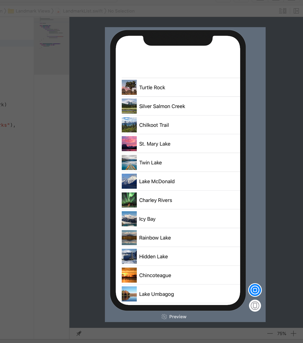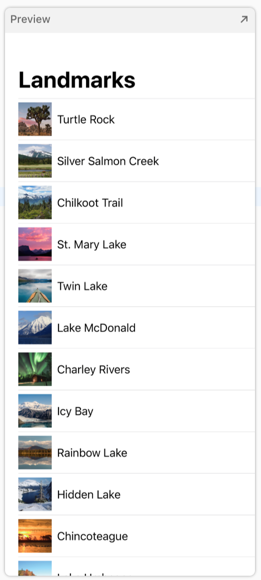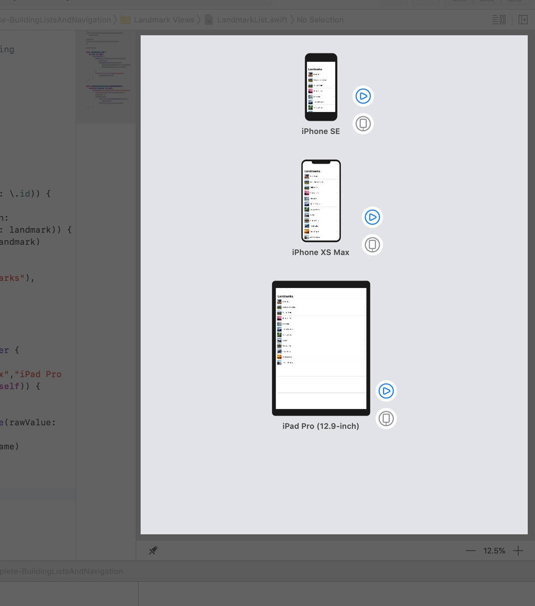 다음으로 LandmarkList_Previews preview provider에 코드를 추가하여 다양한 장치 크기에서 목록보기의 미리보기를 렌더링합니다. 기본적으로 미리보기는 active scheme 에서 장치의 크기로 렌더링됩니다. previewDevice (_ :) 수정 자 메서드를 호출하여 미리보기 장치를 변경할 수 있습니다.