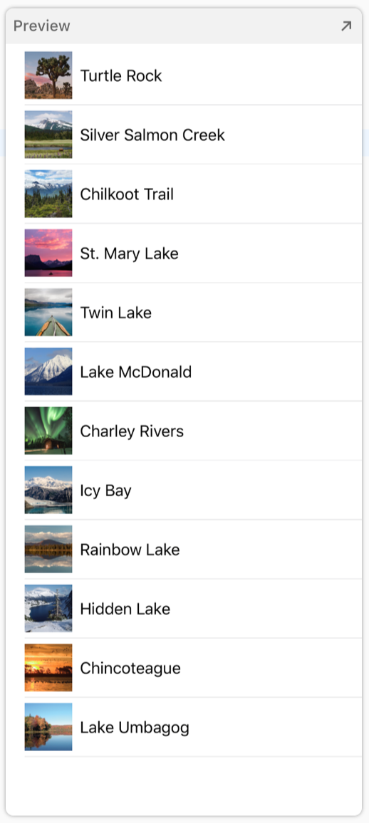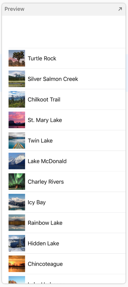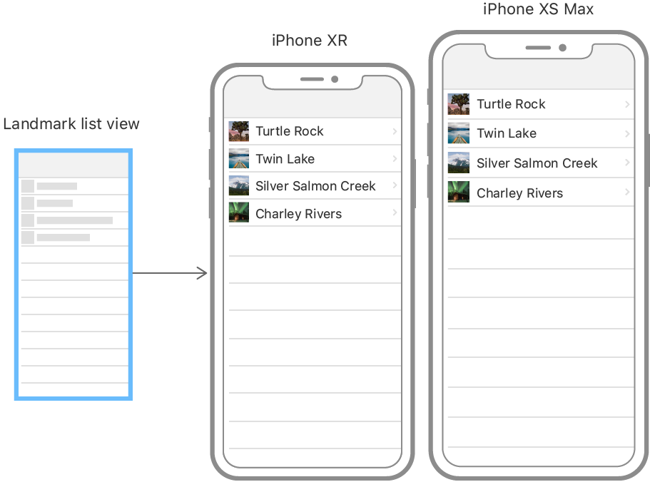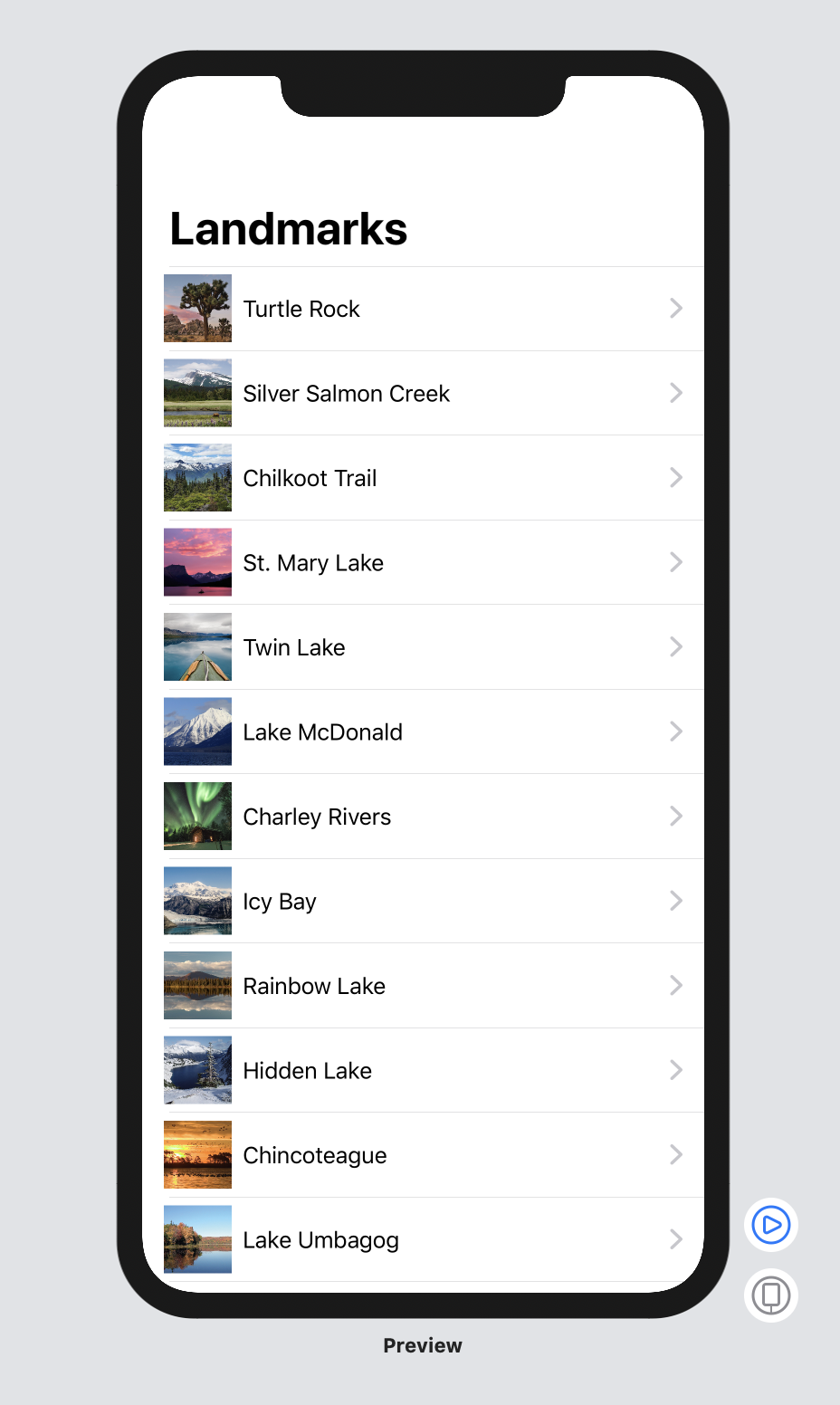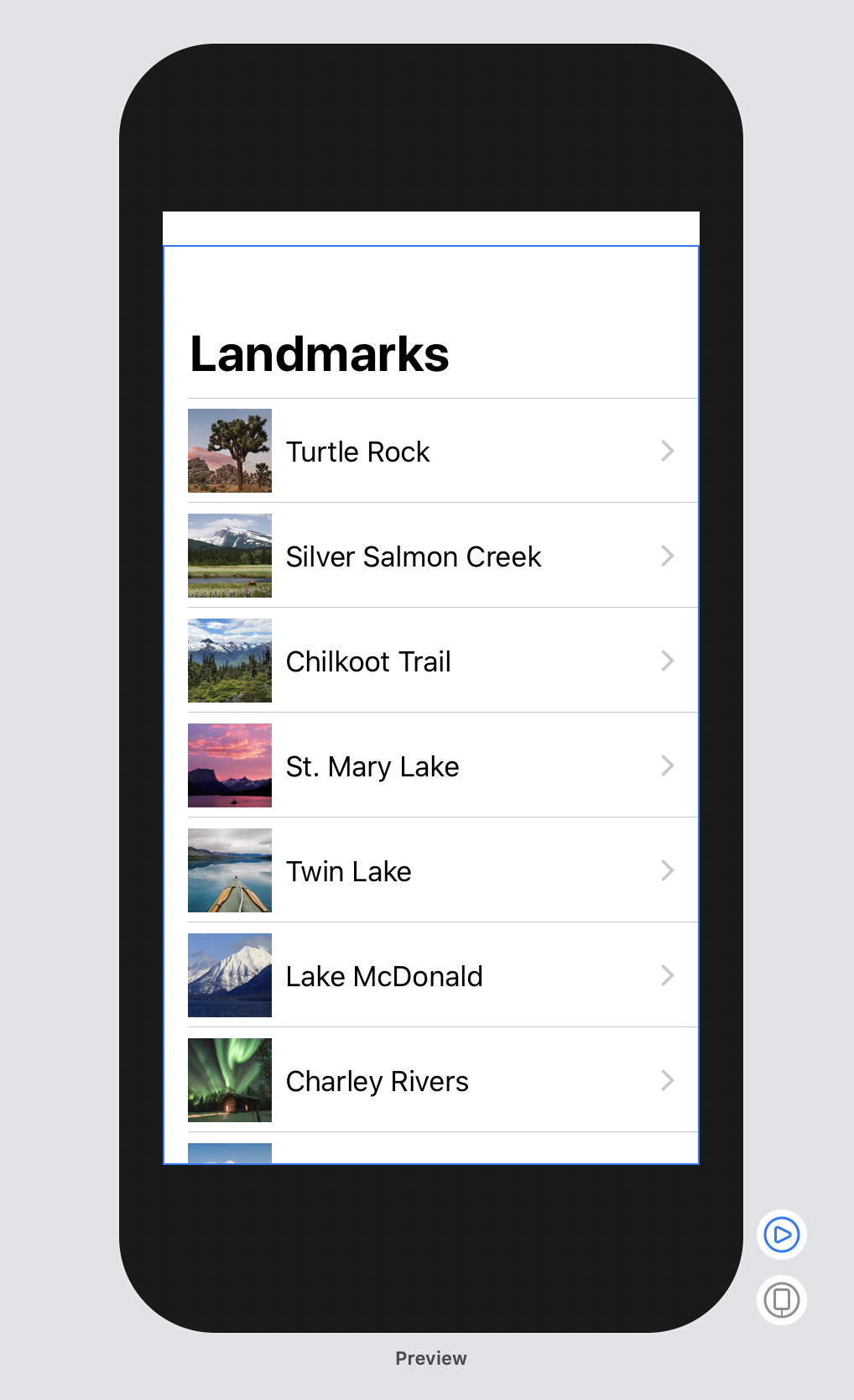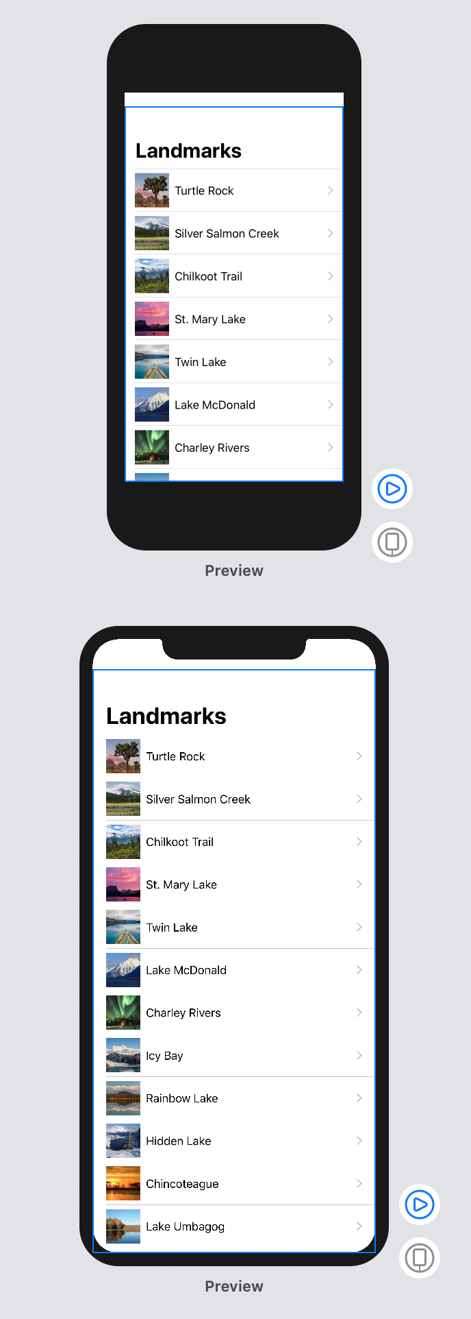 다음으로 LandmarkList_Previews preview provider에 코드를 추가하여 다양한 장치 크기에서 목록보기의 미리보기를 렌더링합니다. 기본적으로 미리보기는 active scheme 에서 장치의 크기로 렌더링됩니다. previewDevice (_ :) 수정 자 메서드를 호출하여 미리보기 장치를 변경할 수 있습니다.