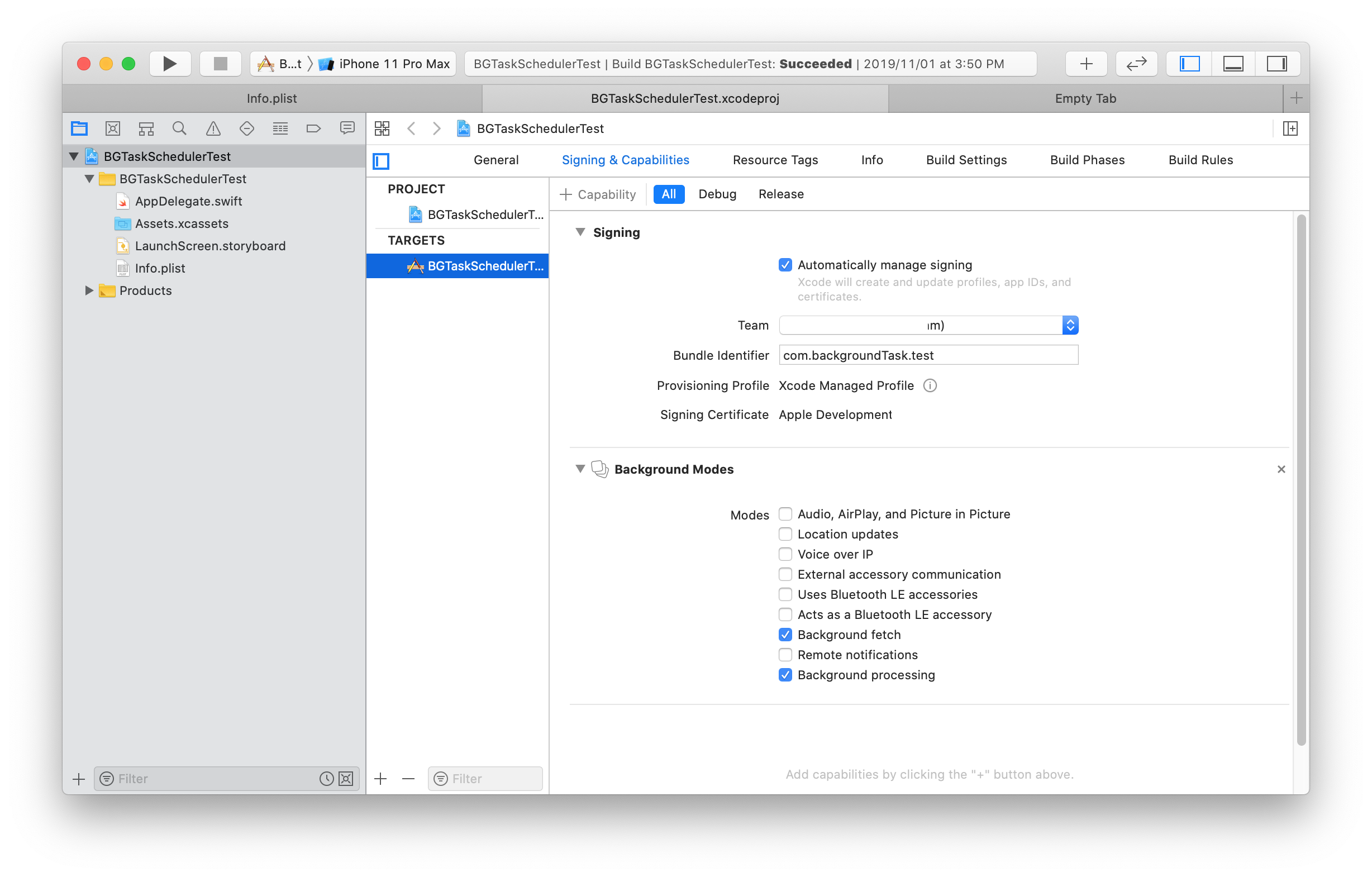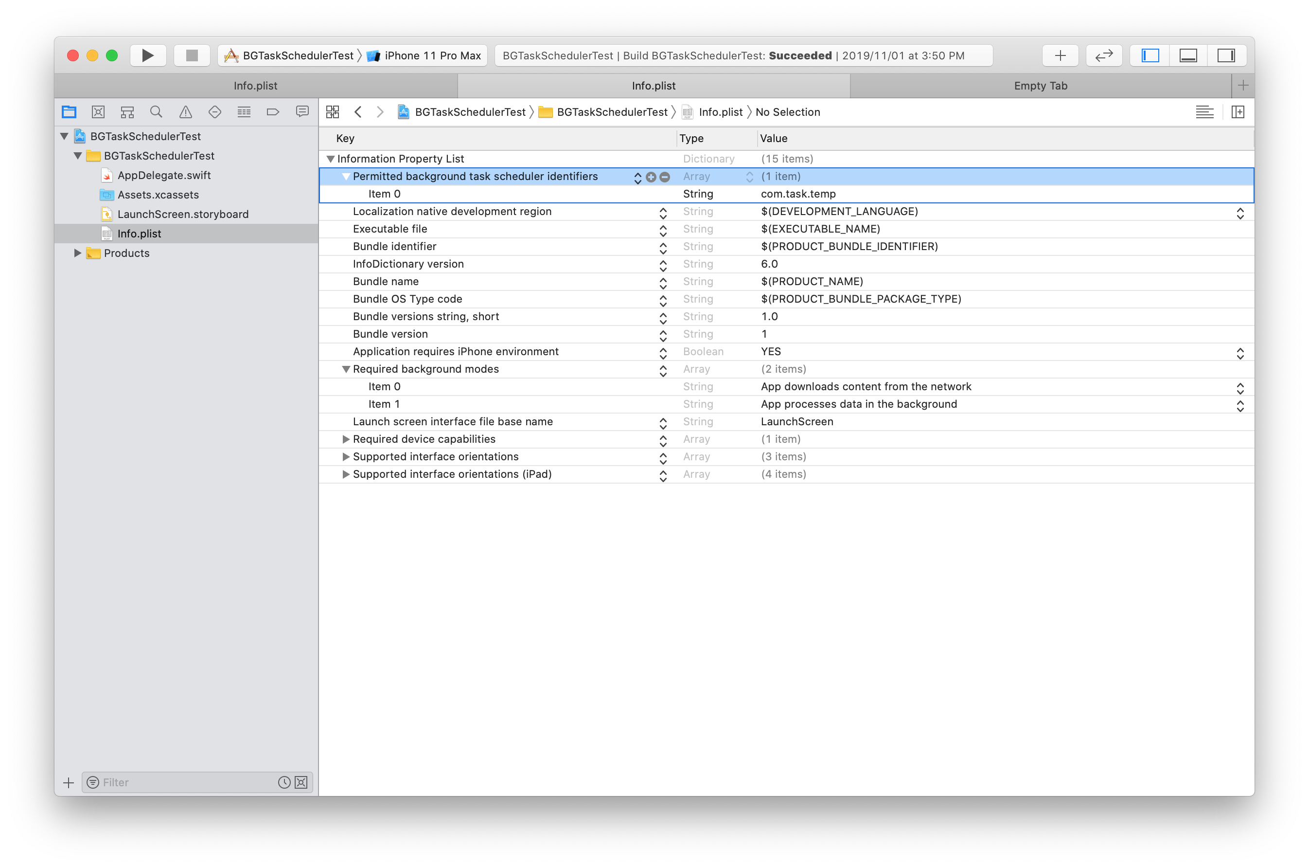 3. info.plist에 Permitted background task scheduler identifiers를 추가하고 background task가 필요한 만큼 item을 추가하여 식별자를 지정합니다.