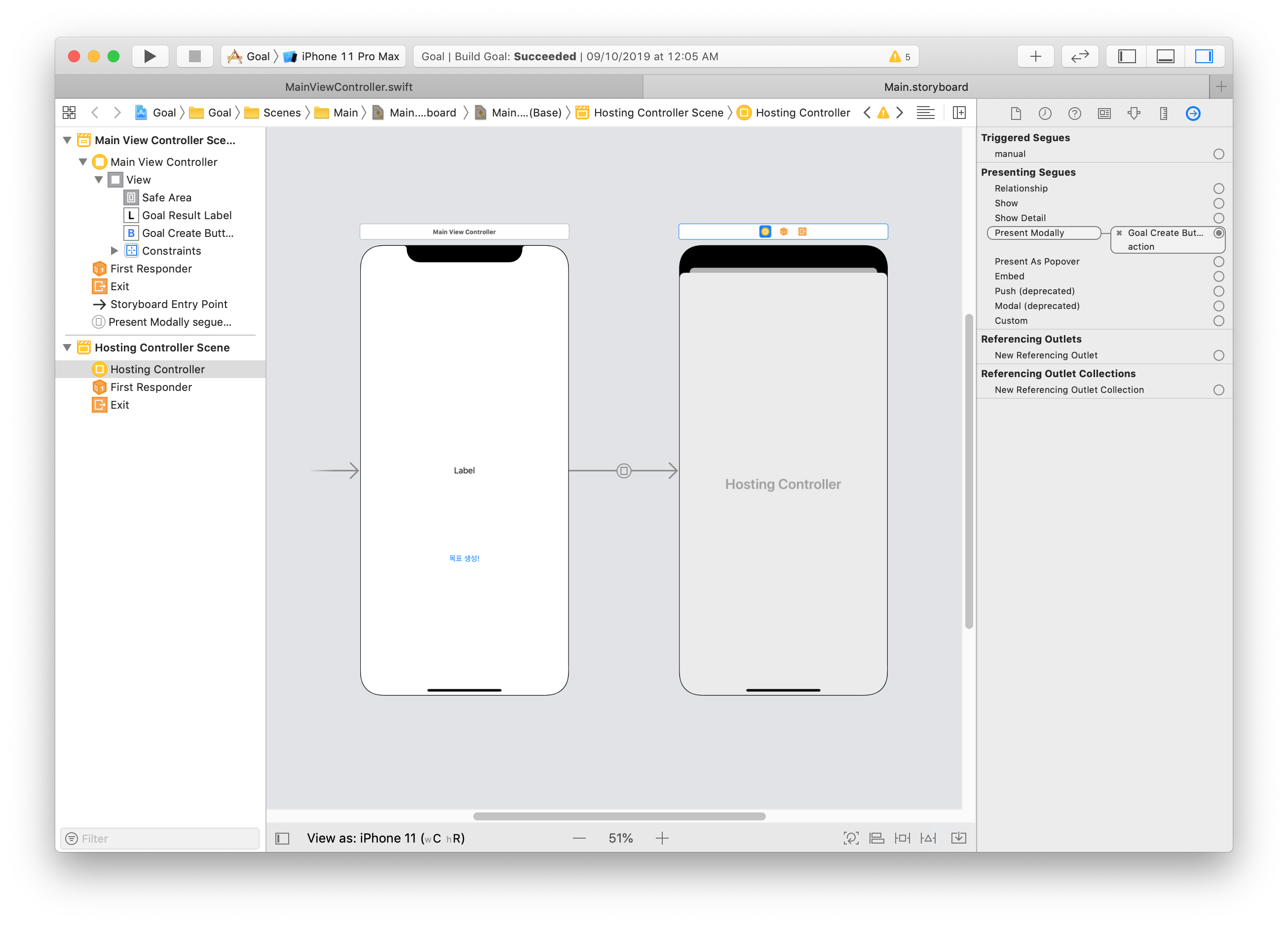 그리고 위 이미지처럼 UIButton이나 UIVIewController의 에서 Control버튼을 누 추가한 HostController로 마우스 Drag를 하면 IBSegueAction을 연결할 수 있습니다.