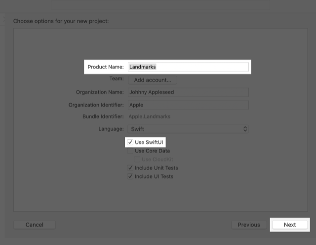Enter “Landmarks” as the Product Name, select the Use SwiftUI checkbox, and click Next. Choose a location to save the Landmarks project on your Mac.