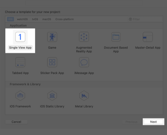 In the template selector, select iOS as the platform, select the Single View App template, and then click Next.