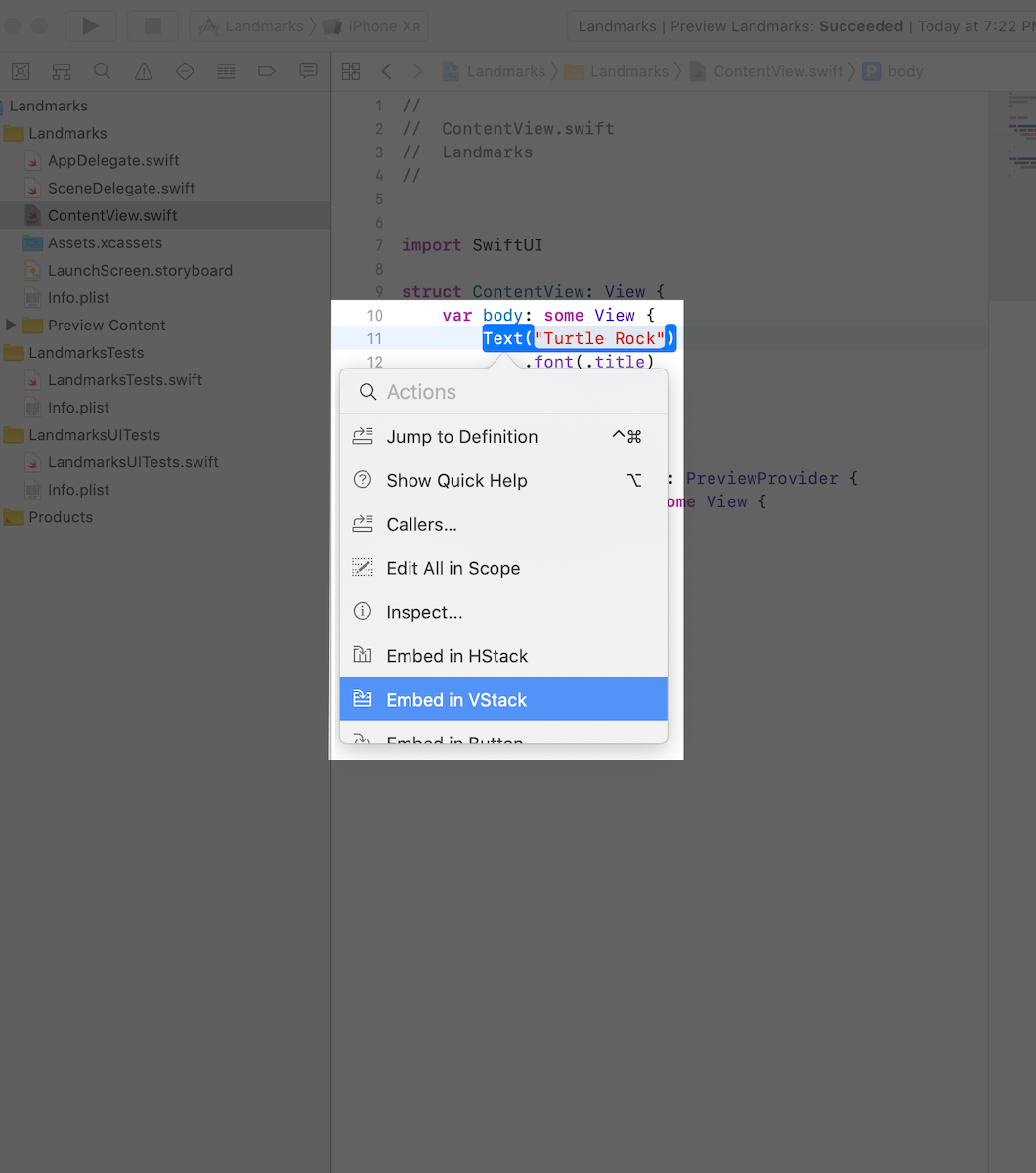 Command-click the text view’s initializer to show the structured editing popover, and then choose Embed in VStack.