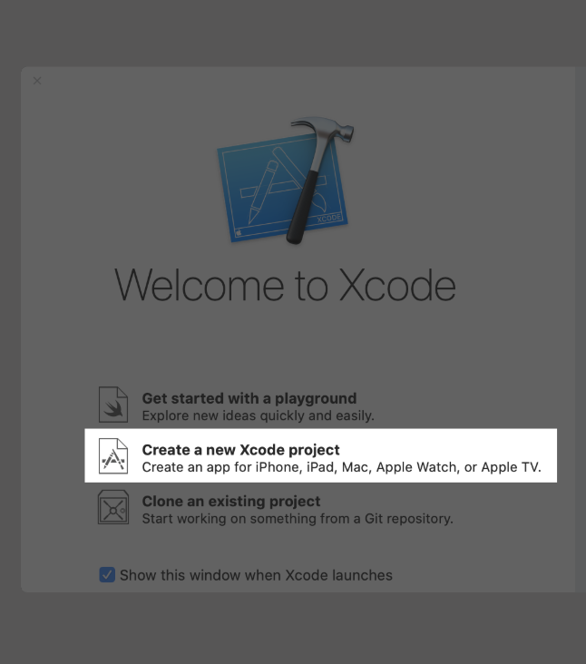 Open Xcode and either click Create a new Xcode project in Xcode’s startup window, or choose File > New > Project.