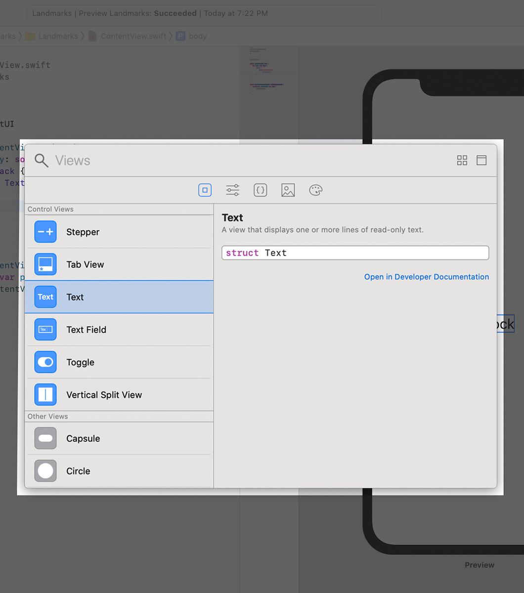 As you build the Landmarks app, you can use any combination of editors: the source editor, the canvas, or the inspectors. Your code stays updated, regardless of which tool you use.